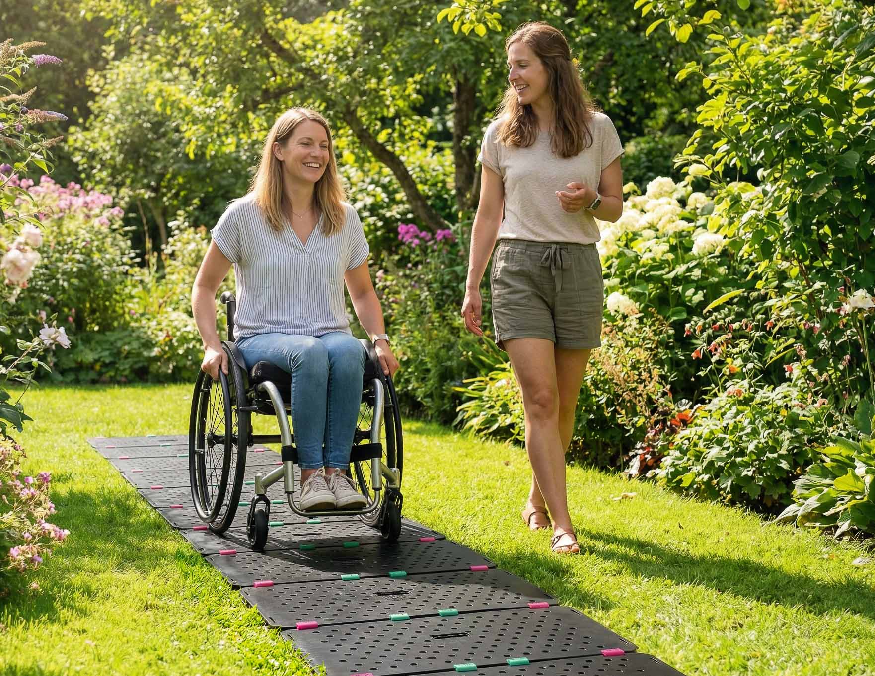 Die TRAIL-MATE Wegeplatten sind so konzipiert, dass sie auf sehr unterschiedlichen Untergründen einsetzbar sind – insbesondere um mit einem Rollstuhl, Kinderwagen oder Gehhilfen über sonst schwer begehbares Gelände zu gelangen. wie z.B. Sandstrand, Kies oder eine unebene Wiese.